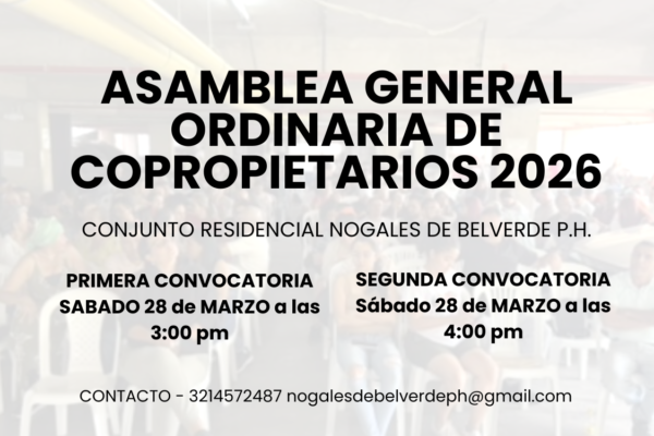 marzo 12, 2026 0 Comment ASAMBLEA PROPIETARIOS 2026PRIMERA CONVOCATORIA SABADO 28 de MARZO a las 3:00 pm SEGUNDA CONVOCATORIA Sábado 28 de MARZO a las 4:00 pm Lugar: Torre de Parqueadero Piso Nº 100 CONTACTO 3214572487 nogalesdebelverdeph@gmail.com Read More Uncategorized fashion, woman